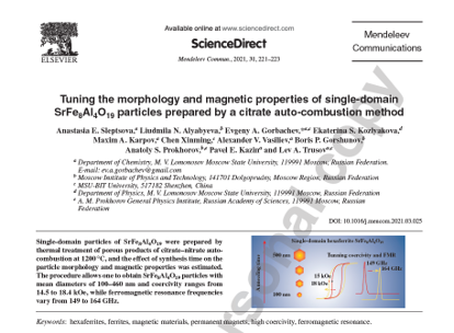 3.Tuning the morphology and magnetic properties of single-domain SrFe8Al4O19 particles prepared by citrate auto-combustion route,《Mendeleev Communications》, (IF 1.694)。