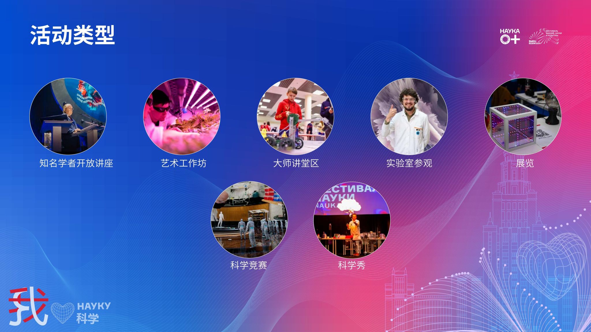“NAUKA 0+(科學無界)”——全俄科學節由俄羅斯教育科學部主辦、莫斯科市政府和莫斯科大學協辦,2006年在莫斯科大學舉辦第一屆,至今已擴至全俄范圍。