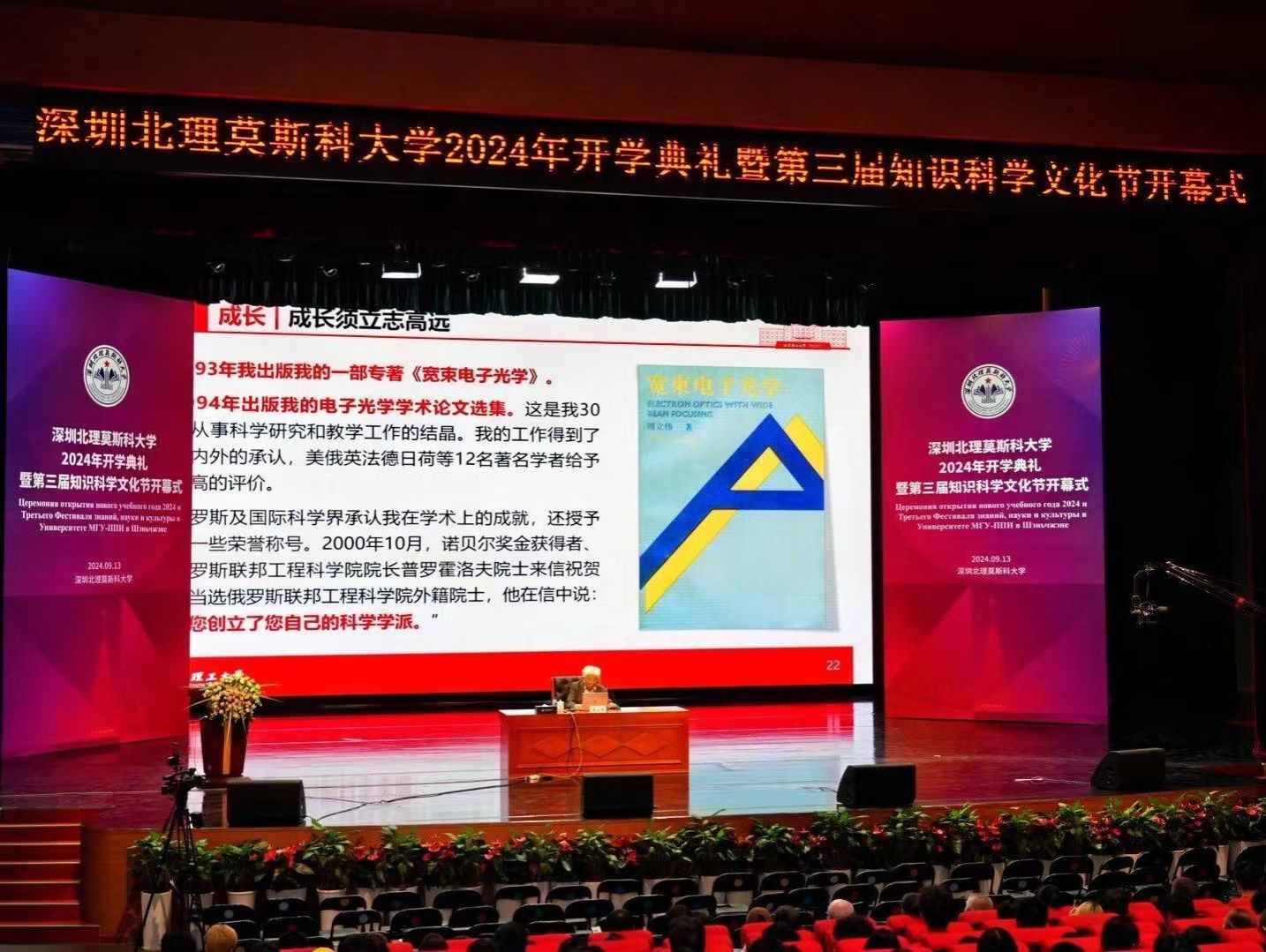 9月13日下午,深圳北理莫斯科大學第三屆知識科學文化節首場學術報告在學校禮堂舉辦。中國工程院院士、北京理工大學教授、博士生導師、首席專家,電子光學與光電子成像專家、成像電子光學理論創立者周立偉以《志存高遠·求深愿達——與青年同學談成長、成才、成功》為題,與深北莫2024級新生分享成長、成才、成功的感悟。