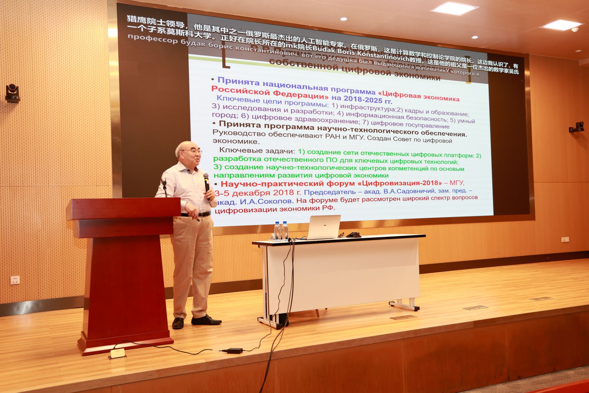 10月14日,在主題為“數字經濟、數學模型與預測”的講座中,阿卡耶夫回顧了數字經濟的發展歷程,解釋了如何通過數學模型來預測未來的經濟趨勢。他介紹了數字技術的崛起以及它在全球范圍內對經濟產生的深遠影響,詳細講述了數字經濟的核心要素,如人工智能、云計算、區塊鏈技術等,并分析了它們如何推動全球經濟的轉型。他還特別提到,未來的經濟增長將更加依賴信息和數據,而不再是傳統的生產資源。