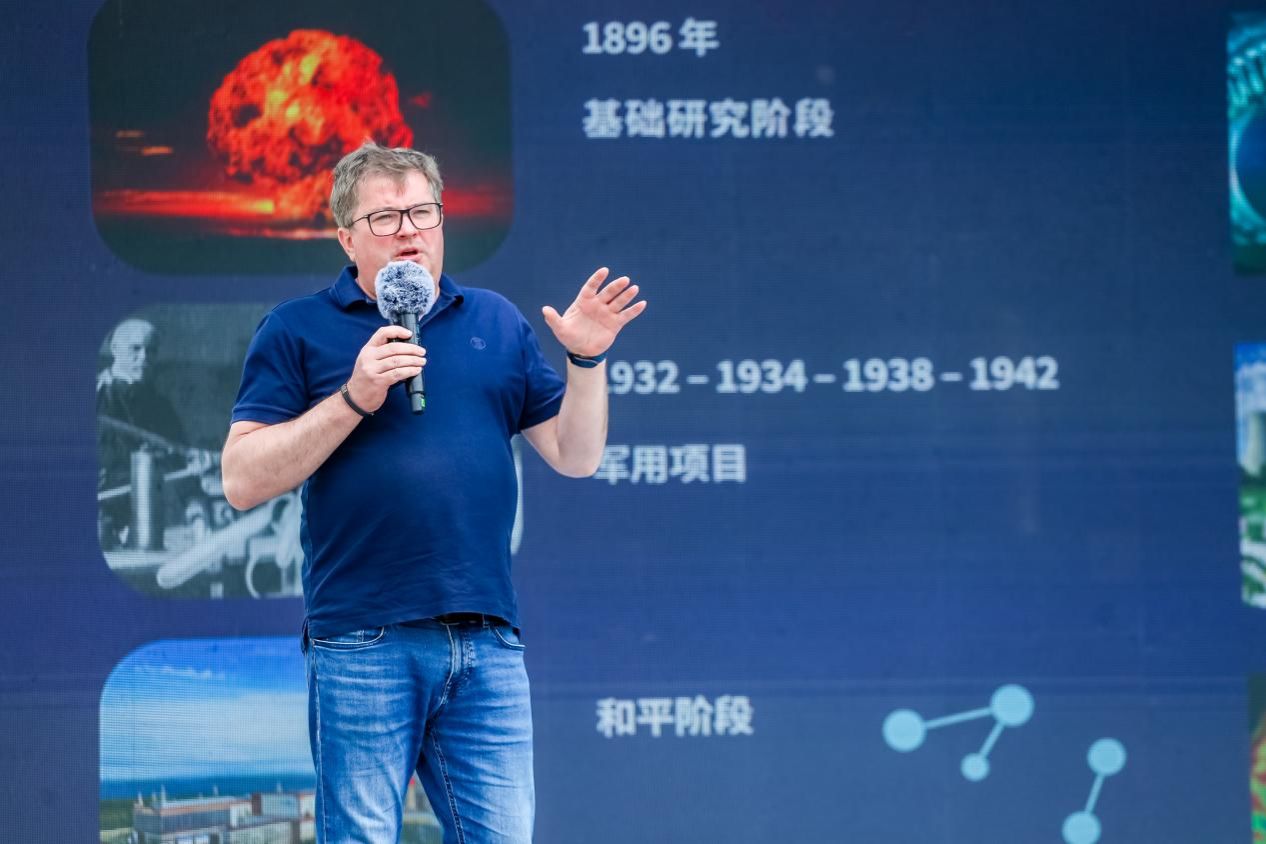 卡爾梅科夫指出,人類接觸到的輻射絕大多數源自自然界,而由人為因素如核試驗和泄漏造成的輻射僅占3%-5%。他強調,放射線在醫療領域的應用,尤其是核醫學,已經成為對抗癌癥的關鍵工具。他帶領現場觀眾回顧了放射性化學的發展歷程,從早期的基礎研究,經過軍事應用階段,到現在的和平利用,特別是在核醫學領域的應用。卡爾梅科夫介紹了幾種放射性元素在醫學診斷與治療中的應用案例,并深入解析了放射性定向治療的機制,特別提到了其團隊正在研究的新型放射性分子BI-213-DOTATOC在腫瘤治療方面的潛力。